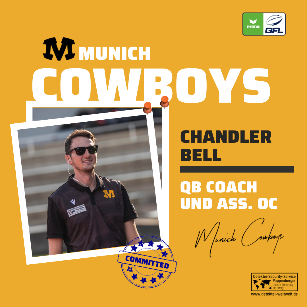Er arbeitet als QB-Coach mit den Spielmachern und ist zusätzlich Assistant Offensive Coordinator. Der US-Amerikaner Chandler Bell wird die Munich Cowboys auch 2023 an der Seitenlinie unterstützen. Seine Spezialisierungen in den Bereichen Offensivschemata und Filmanalyse bringt er dabei ebenso ein wie seine positive Einstellung und seine Liebe zum American Football. Zudem wird er OC Justin Sottilare bei der Entwicklung von Spielplänen, Playcalls und der Implementierung des Playbooks unterstützen. Bereits 2022 hatte er großen Anteil an der positiven Entwicklung des Angriffs der Münchener.